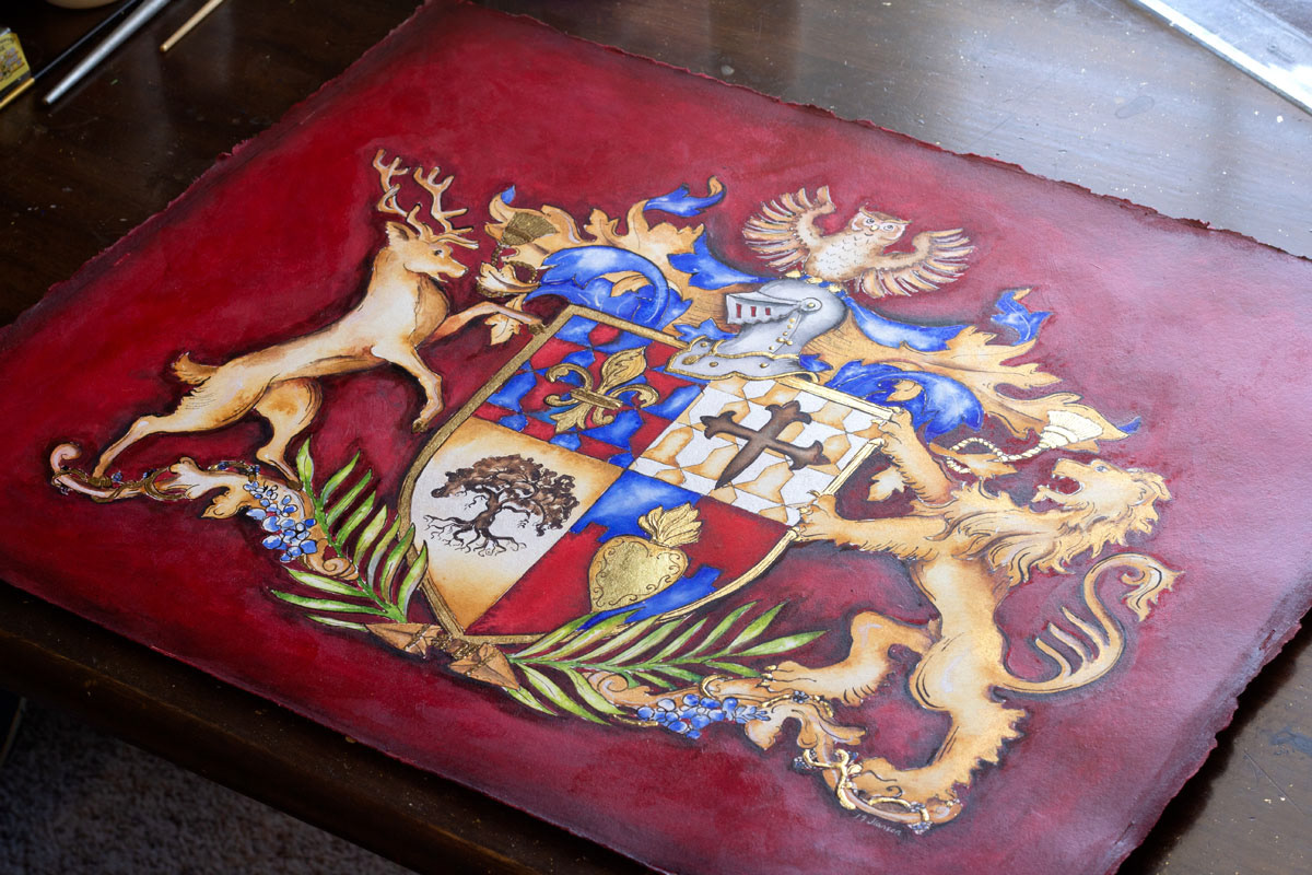 Coat of arms with a stag and a lion. 16" x 20" watercolor and gold leaf on paper.