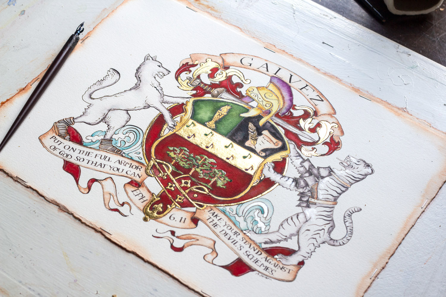 I added plenty of gold leaf to their artwork and painted it in watercolor and ink. I mailed the piece out in advance of their anniversary. Derius wrote, "The box arrived safely and I was blown away. It is priceless!"