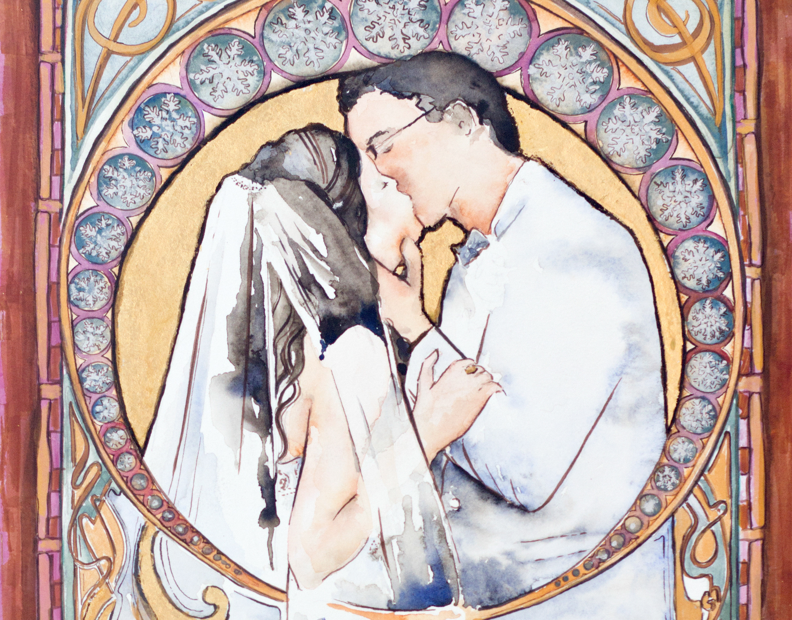14" x 11" watercolor and gold leaf on paper featuring a pair of elephants.