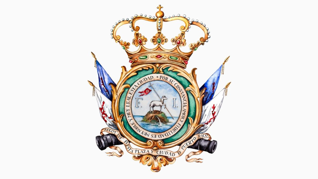 The original coat of arms of San Juan was granted by Spain in 1511: making it the oldest heraldic achievement still currently in use in the Americas. My illustration is similar to the official arms of Puerto Rico and the arms of the City of San Juan, but we intended this art to be a celebration of the history of San Juan, and as faithful as possible to the image of the garrison regiment arms painted sometime between 1798 and 1804. We researched and re-constructed a color version of the arms which I painted and shipped to him in 2018.