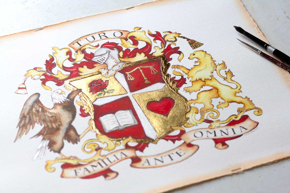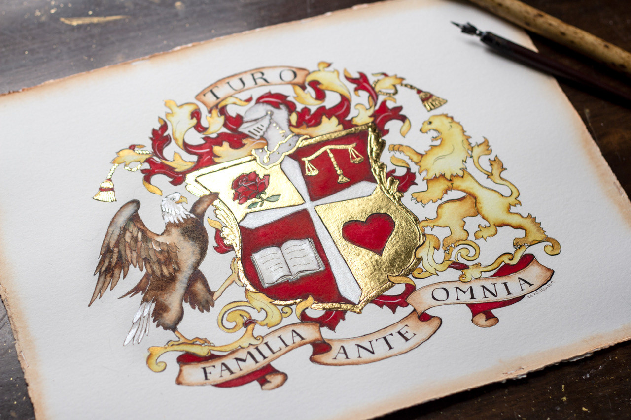 This is a 11" x 14" watercolor family crest. This piece features an eagle and a lion, with symbols of the family's faith and heritage.