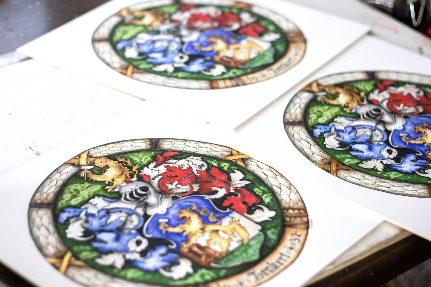 This 14" x 14" piece was painted from a photo of a stained glass window. I love being able to share these elegant vintage pieces. Do you have a coat of arms in your family? Reach out to create a new artwork based on your vintage piece.
